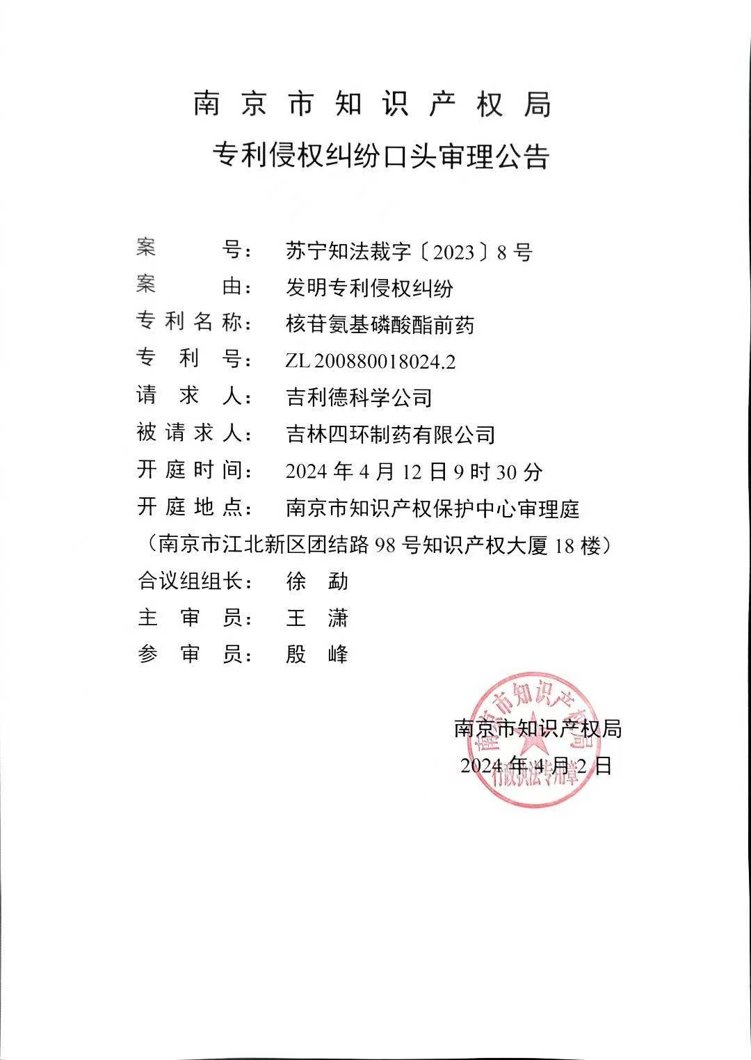 | 信息名称: | 专利侵权纠纷口头审理公告 | ||