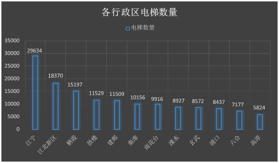 南京市12个行政区在用电梯分布情况如下,其中江宁区电梯数量最多29634台;高淳区电梯数量最少5824台。