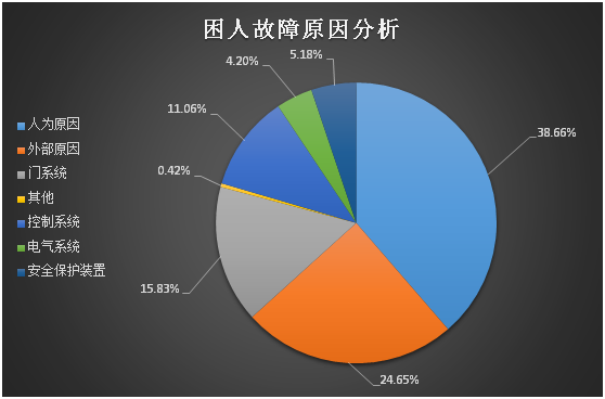 依据《电梯应急处置平台技术规范》(CPASE M001—2019),在人为原因、外部原因、门系统、曳引系统、导向系统、轿厢、控制系统、电气系统、安全保护装置九类故障中:人为原因故障(276起,占38.66%)、外部原因故障(176起,占24.65%)、门系统故障(113起,占15.83%)居前三位,其中生活(装修)垃圾导致开关门受阻困人239起、停电困人78起、门锁失效78起。