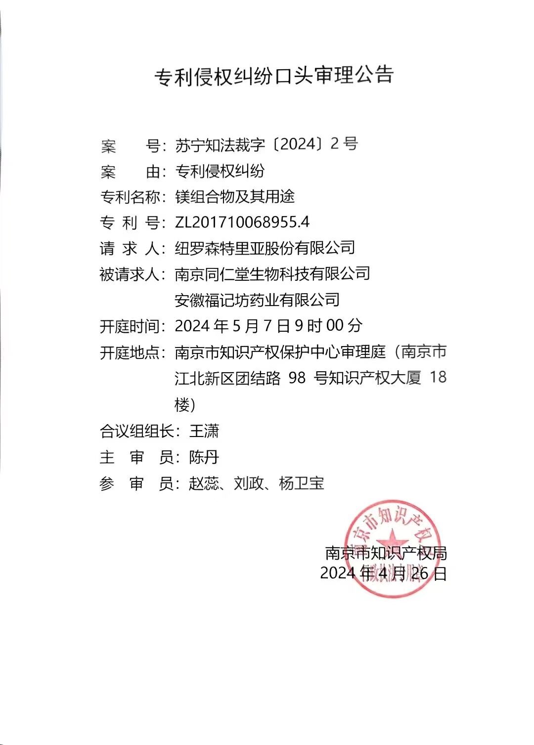 开庭地点:南京市知识产权保护中心审理庭(南京市江北新区团结路98号知识产权大厦18楼)